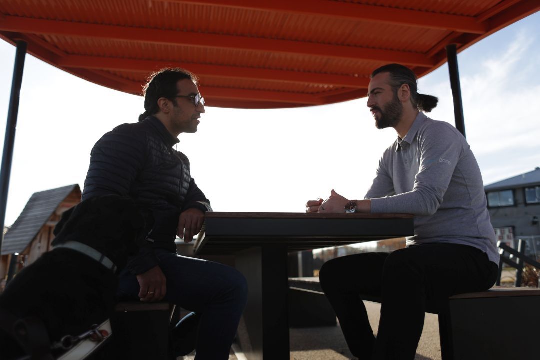 Two men talking at an outdoor table during community access support, dog nearby